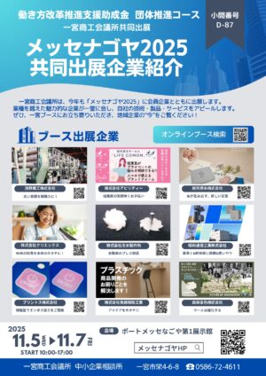 一宮商工会議所では、ものづくり企業等の販路開拓を目的に、日本最大級の異業種交流展示会「メッセナゴヤ2025」に地元企業9社と共同出展します。会員企業の皆様のお越しをお待ちしております!