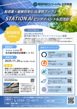 尾張共創コンソーシアム※では、スタートアップとの連携を促進するため、愛知県が運営するオープンイノベーション拠点「STATION Ai」を活用した取組みを進めています。今回は「業務効率化と生産性アップ」をテーマに、経営課題解決に資するサービスを提供するスタートアップ登壇によるピッチイベント&交流会を開催します。スタートアップ企業との共創やオープンイノベーションにご関心のある企業の皆様のご参加を、心よりお待ちしております。