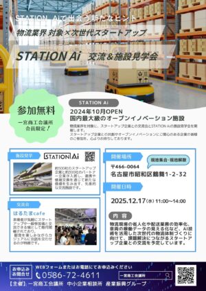 一宮商工会議所では、スタートアップとの連携を促進するため、愛知県が運営するオープンイノベーション拠点「STATION Ai」を活用した取組みを進めています。今回は物流業界を対象にスタートアップ企業との交流会とSTATION Aiの施設見学ができる企画を開催します。物流業界の皆さまが新たなビジネスチャンスをつかむきっかけとして、ぜひご参加ください。
