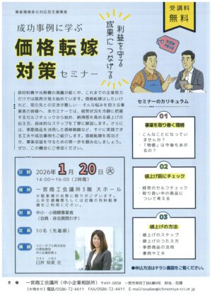 そんな悩みを抱える事業者の皆様へ、本セミナーでは、経営状況を冷静に把握するセルフチェックから始め、納得感を高める値上げの伝え方、具体的なステップを丁寧に解説します。さらには、季節商品を活用した価格戦略など、すぐに実践できる工夫や成功事例もご紹介します。価格転嫁を成功させ、事業収益を守るための第一歩を踏み出しましょう。この機会にご参加ください。