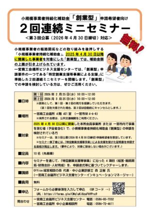 一宮商工会議所ビジネス支援センターでは、「創業型」申請要件の一つである「特定創業支援等事業による支援」に準拠した2回連続ミニセミナーを開催します。「創業型」での申請を検討している方は、ぜひご活用ください。