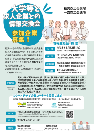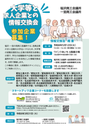 稲沢・一宮の両商工会議所では、会員企業の求人活動をお手伝いするため、大学等の就職支援担当と企業の採用担当者様との間で、学生の就職動向や企業の採用計画等を伺うことを目的とした情報交換会を、合同で開催します。