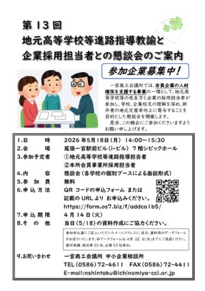 本所では、会員企業の人材確保を支援する事業の一環として、地元高等学校等の先生方と企業の採用担当者が参加し、学校、企業相互の理解を深め、新卒者の地元定着率向上に寄与することを目的とした懇談会を開催します。是非、この機会にご参加ください。