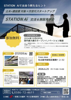 一宮商工会議所では、スタートアップとの連携を促進するため、愛知県が運営するオープンイノベーション拠点「STATION Ai」を活用した取組みを進めています。今回は土木・建設業を対象にスタートアップ企業との交流会とSTATION Aiの施設見学ができる企画を開催します。土木・建設業界の皆さまが新たなビジネスチャンスをつかむきっかけとして、ぜひご参加ください。